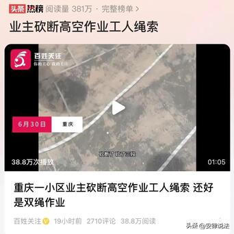 “太冲动了!”重庆,一小区外墙瓷砖大面积脱落,需要清理恢复,物业找来维修工人高空作业,万万没想到,因施工时不小心弄坏了一业主在楼顶种植的花草,业主恼羞成怒,拿起工兵铲将正在高空作业的工人身上系的安全绳砍成3段。幸而业主砍断的只是一根副绳,安全员在上面看守,及时制止,并未发生危险。